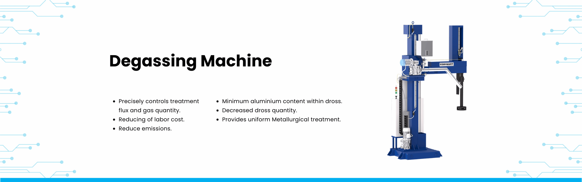 Equismart Degassing machine efficiently removes hydrogen with adjustable rotor speed, PLC control, fault displays, and precise gas control, supporting both auto and manual modes.