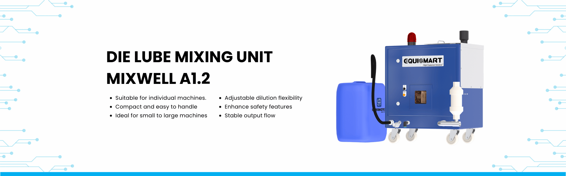 Equismart mixwell die lubricant unit is a compact, portable and fully automatic mixing unit with pneumatic and mixing pumps suitable for individual machines.